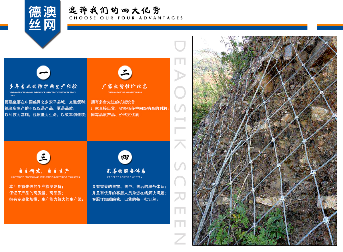 安平縣德澳絲網(wǎng)制品有限公司集研發(fā)、設(shè)計(jì)、生產(chǎn)、銷(xiāo)售于一體,主要生產(chǎn)邊坡防護(hù)網(wǎng),被動(dòng)環(huán)形網(wǎng),GPS2型主動(dòng)防護(hù)網(wǎng),山體護(hù)坡網(wǎng),形防護(hù)網(wǎng)等堤坡防護(hù)產(chǎn)品。我公司擁有大批十年以上生產(chǎn)經(jīng)驗(yàn)的工程師、技師生產(chǎn)工人,打造高科技邊坡防護(hù)網(wǎng)等產(chǎn)品的多樣化讓客戶(hù)擁有更多選擇的空間,篩選出更適合工程需求的產(chǎn)品。